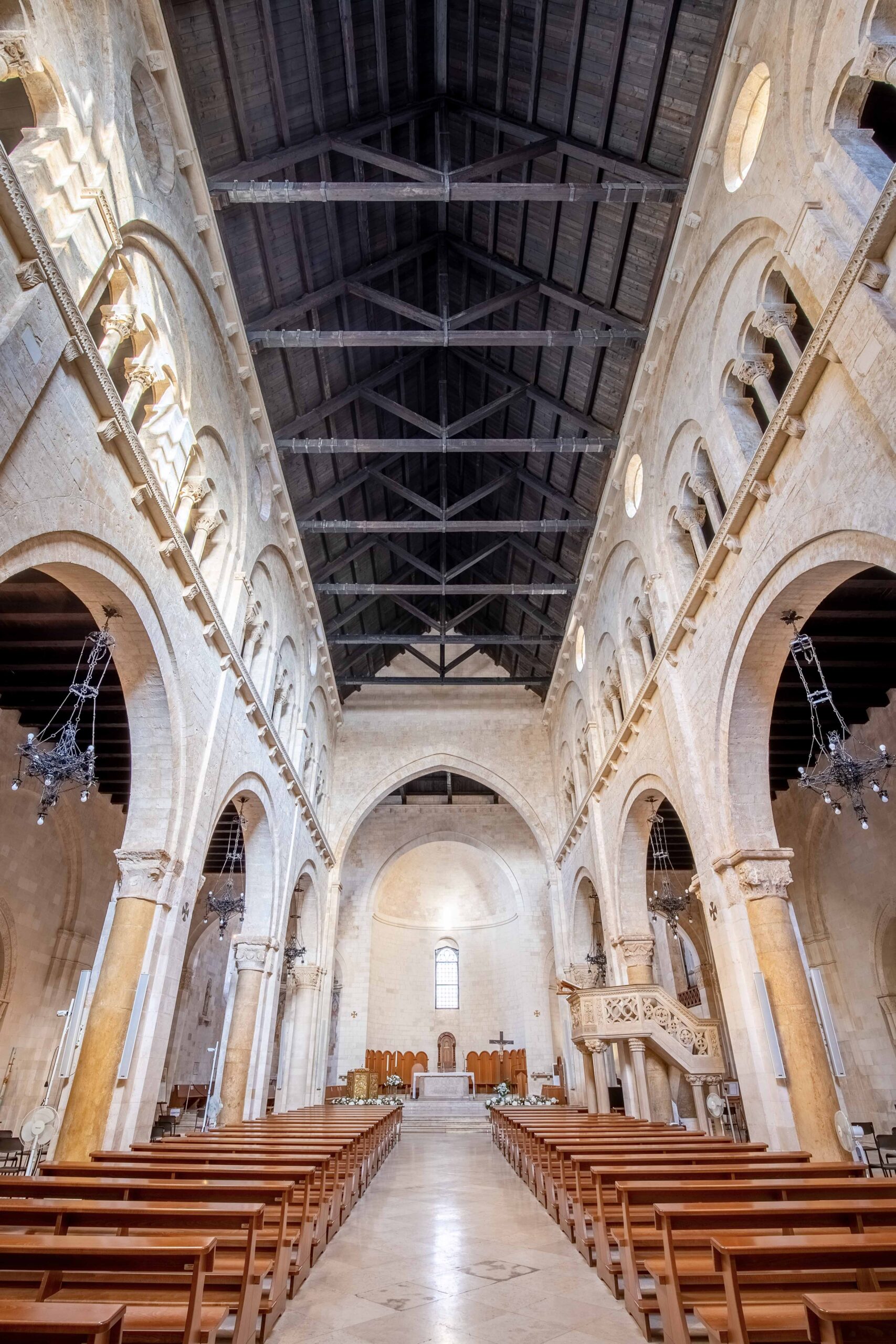 L’interno della cattedrale incanta per la sua austerità. Le murature imponenti e le pareti spoglie, unite ai giochi di luce che si alternano durante il giorno, evocano un’atmosfera di solenne silenzio, tipica della vita religiosa medievale.
